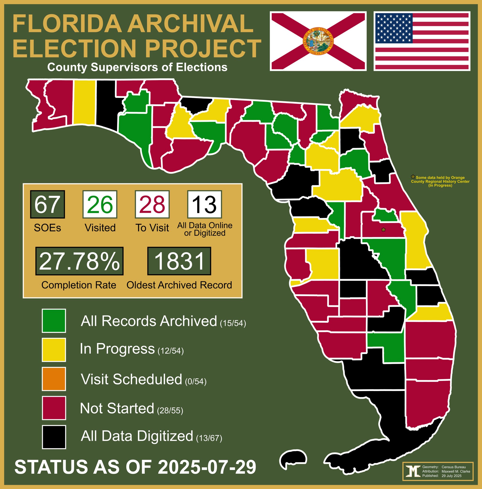 The State of Florida maintained no historical record of state election results by precinct until 2012 and has never collected local election results. Since 2024, I have traveled to election offices across the state in order to document and archive all available election results, including by precinct and for local office, as far back in time as possible. As of July 2025, I have successfully archived results for 15 of 54 counties for which physical records exist. The ultimate objective of this project is to create a free public archive of digitized Florida election results. Status updates will be posted from Twitter and Bluesky.